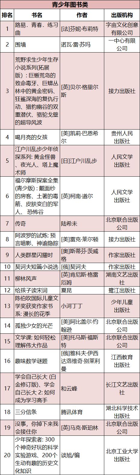 ◆ 青少年图书类TOP20中,前两种皆为台湾原版书。上榜的系列图书较多,接力出版社“荒野求生少年生存小说”、人民文学出版社“江户川乱步少年侦探”“福尔摩斯探案全集 (青少版) ”、长江文艺出版社“学会自己长大”、北京工业大学出版社“少年探索者”等均有图书上榜,“荒野求生少年生存小说”更是有5个品种上榜。