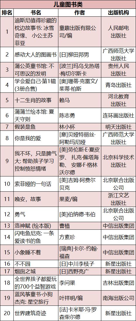 ◆ 儿童图书类TOP20中,童趣出版有限公司《迪斯尼值得珍藏的枕边故事书》位居榜首。该类别中,绘本作品居多,如广西师范大学出版社《感动大人的图画书》、明天出版社《假装是鱼》、中信出版集团《洛神赋》等。近年来,优秀传统文化是童书领域的大热题材,上榜图书中,也有2种与传统文化相关。