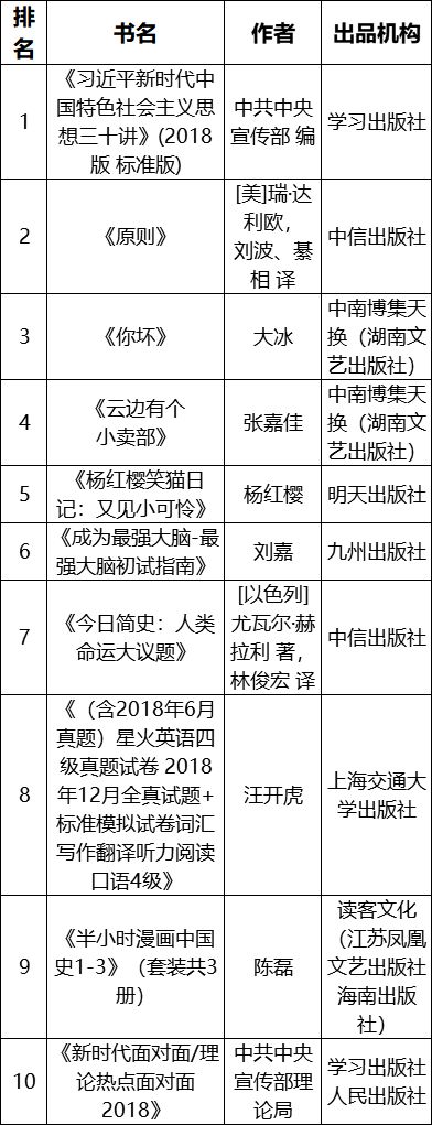 ◆ 畅销新书榜:系列作品占优势 从年度畅销新书TOP10中可以看出,畅销作家的新品《你坏》《云边有个小卖部》,畅销系列图书新品《杨红樱笑猫日记:又见小可怜》《今日简史:人类命运大议题》依然有着很好的销量。年度畅销新书TOP100中,原创图书共67种。畅销新书TOP100与畅销书TOP100最大的区别是系列作品上榜较多,比如“洋洋兔童书”系列3种图书、“半小时漫画中国史/世界史”4种图书,“注册会计师教材”“肖秀荣考研”等系列也均有多种图书上榜。