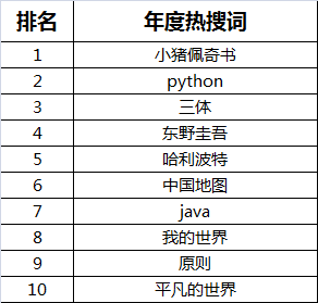 年度热搜词和年度畅销书有一定的重合度,比如:《平凡的世界》、《原则》、东野圭吾、《三体(套装1-3册)》。更有意思的是,python、java这样的计算机类名词也进入到热搜词TOP10之中。在计算机普及的今天,python、java编程也陆续被纳入小学教材课程,无疑增加了人们对于该类词语的搜索。