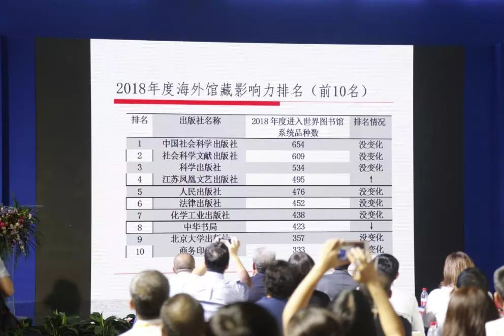 据社科社党委书记、社长赵剑英介绍,社科社与30余家国际知名出版社建立版权贸易和图书合作出版关系,与国外出版社签约“走出去”483项,语种涵盖英文、西班牙文、阿拉伯文、日文、俄文等10多种文字。“中国图书世界馆藏影响力调查报告”显示,2018年社科社海外入藏图书品种654种,继2017之后,再次位列全国600多家出版社首位,影响力蝉联第一。在“2018中国图书海外馆藏影响力英文图书10强”排名中,位列第六。